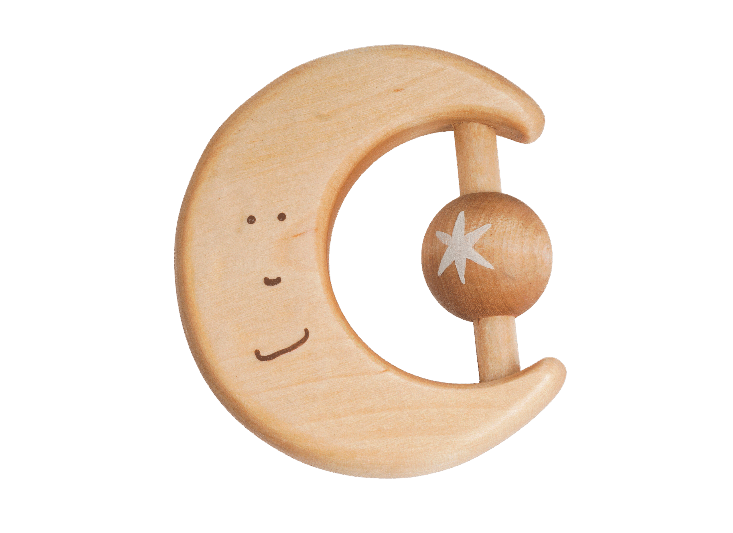Deze handgemaakte, houten bijtring in de vorm van een maan en een ster is gemaakt van natuurlijke materialen en een goede aanvulling op de speelgoedcollectie van je kleintje