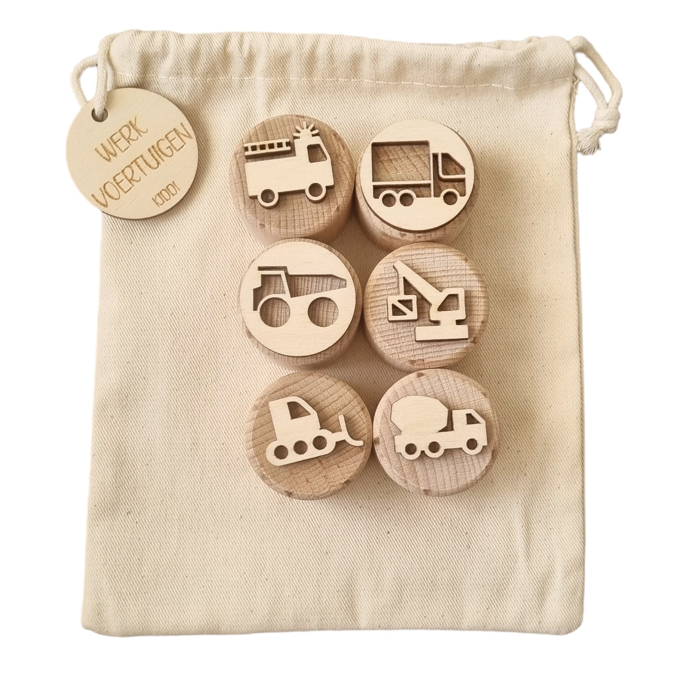 De set bestaat uit 6 ronde stempels met de volgende afbeeldingen: brandweerwagen, vrachtwagen, betonwagen, shovel, kraan en kiepauto.